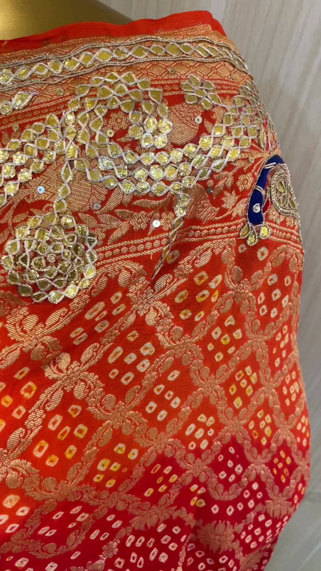 Glamour switches it side in grace and beauty on this pretty Freya Bandhani Saree made in Pure Georgette and Multishade Bandhani fabric with Zero Gottapatti , Zardozi and Pearl Motifs on it.