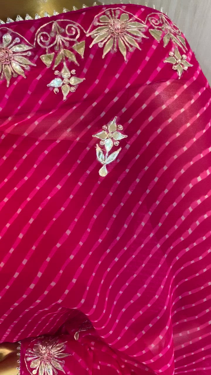 This tempting piece comes in a shade of pink blended with thread work of Gottapatti with Zardozi ,Aari and Pearl Work on renowned Leheriya fabric giving it an enchanting weave of ethnic treasure.