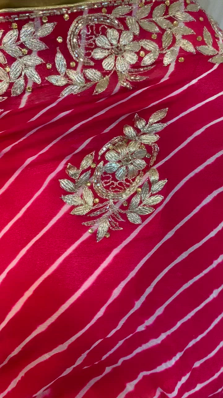 by our craftsman in the spirit of love. This Mothra Kenzie Leheriya Saree is made of embroidered Hand Gottapatti , Zardozi, Aari And Pearl work over it to give it a classy festive look.