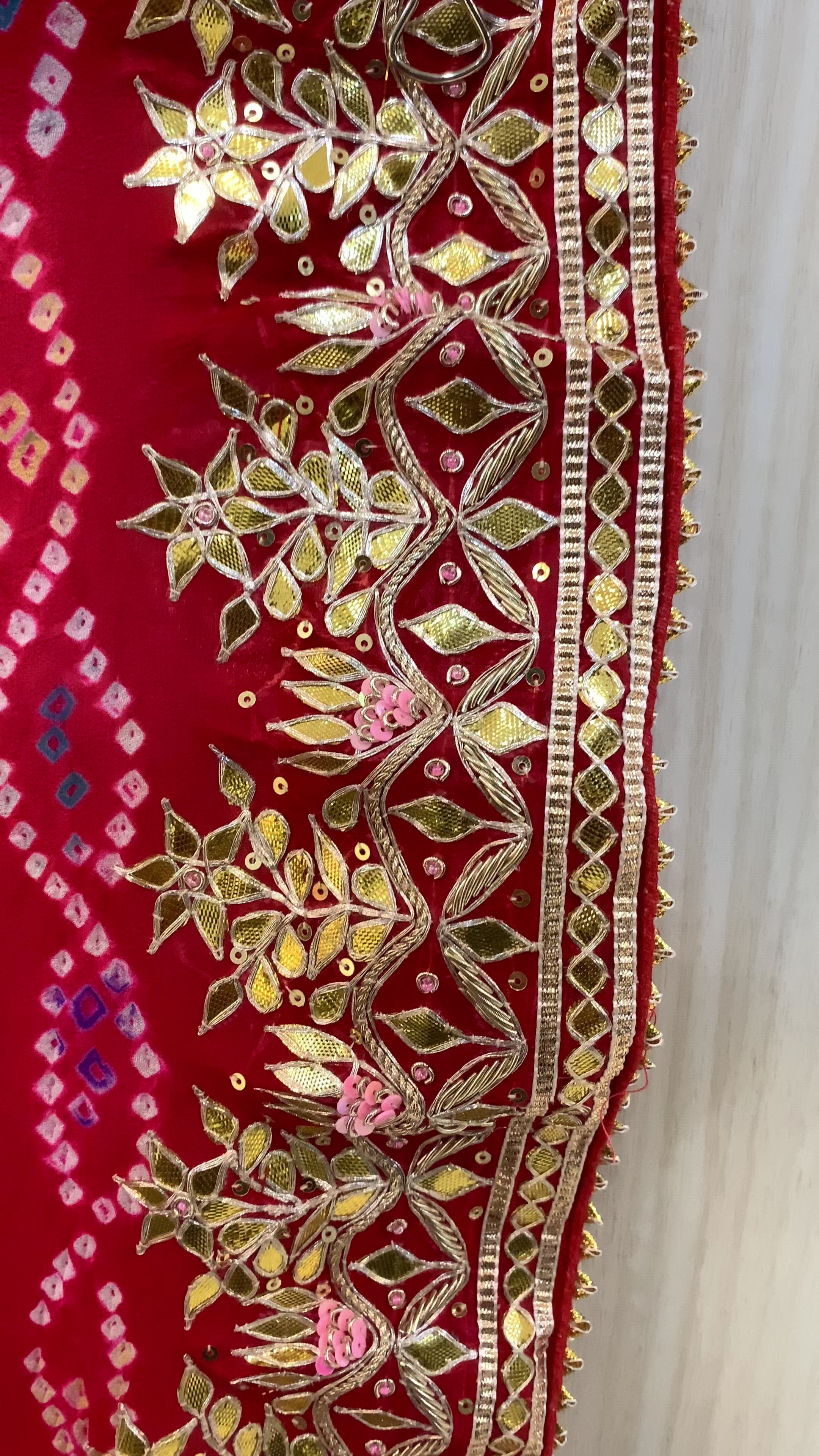 Shining spun by craftsmen of this Multicolor Bandhani Saree adds the necessary tone of glamour to offer you the most pristine and elegant look in room full of people. It comes with Hand GottaPatti on the border and Kardana, Resham and Aari work make this Saree a perfect fit for you.