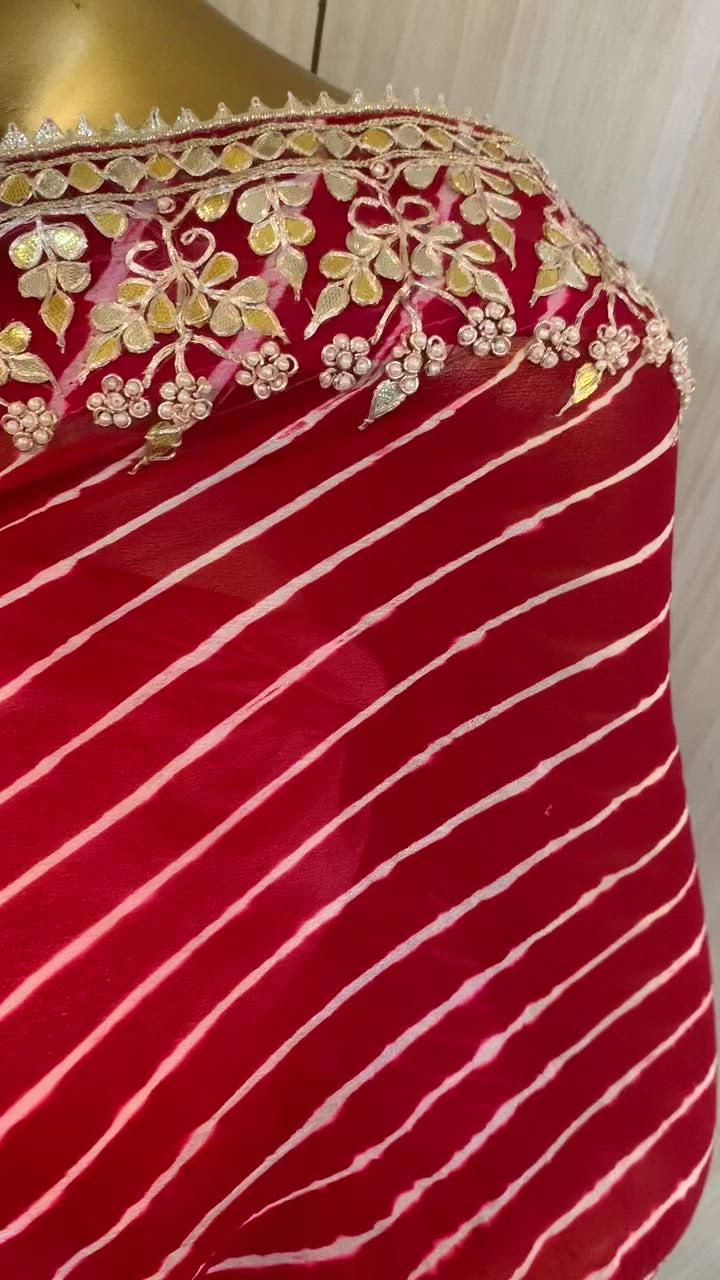 Adorably comfortable and easy to carry this simple yet elegant Zyvana Georgette Leheriya Saree is soaked in the charm of forever being in demand. Woven with delicacy and art in Gottapatti with Zardozi and Pearl Work on this artistic piece comes blended in the red, pink and orange shades. Apt for the exclusive style of comfort and grace.